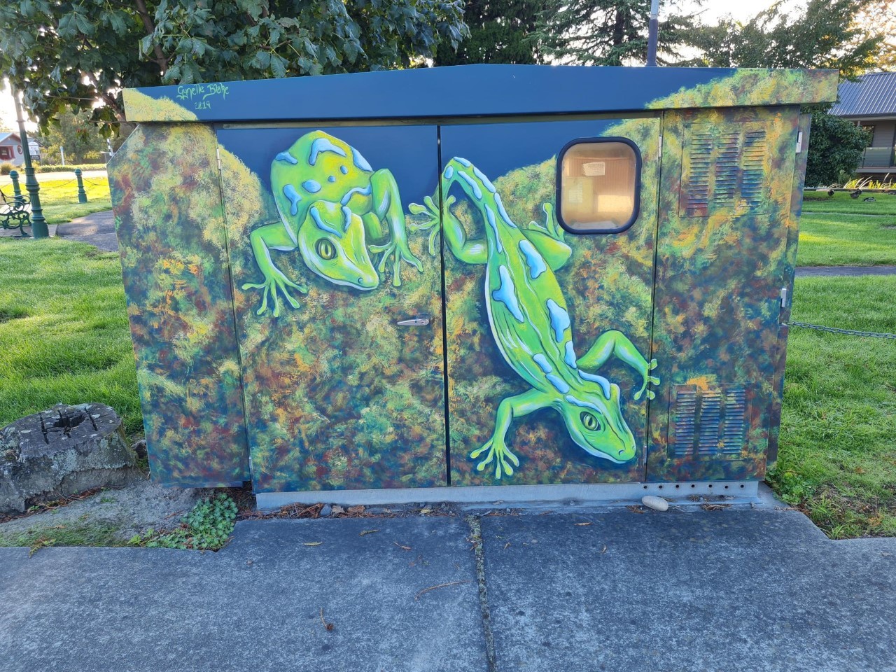 As it is not a Chorus cabinet, I could not go onto the Chorus website to find the provenance of this artwork. However, Gynelle Blake's signature is on the cabinet along with the 2019 date, so I reached out to her and she confirmed, as I suspected, that this piece of artwork depicts the native Jewelled Gecko (Naultinus gemmeus).