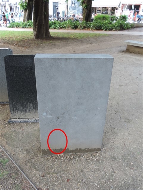 Kijk achteraan de sokkel van dit monument (C) en (D) en geef de namen van de fossielen en het bijhorende nummer.