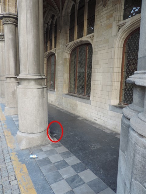 Vervolgens neem je een foto van jezelf of een persoonlijk voorwerp met één van de vele fossielen onder de galerij links van het Paleis van de Grote Raad en deze galerijDUIDELIJK ZICHTBAAR* op de achtergrond en plaats deze foto bij je log.