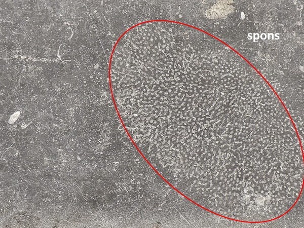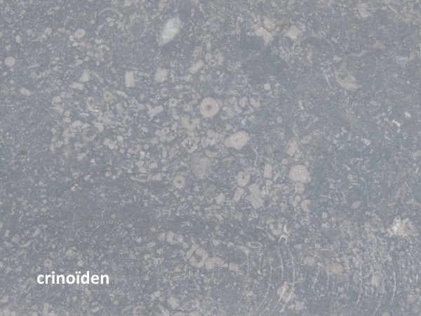 De meest voorkomende restanten die je in blauwe hardsteen kan herkennen, zijn afkomstig van de kalkskeletten en stengeldelen van crinoïden, ook wel zeelelies genoemd. De Nederlandse benaming is misschien wat misleidend, want crinoïden zijn geen planten, maar een diersoort verwant aan zeesterren en zee-egels. In onze streken kwamen crinoïden enorm veel voor en ook nu komen ze nog veelvuldig voor in tropische zeeën.