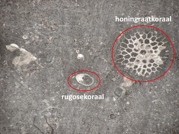 Naast honingraatvormige koraalriffen kan je soms ook fossielen van uitgestorven rugosekoralen vinden. Dit type koraal leefde solitair en dus niet samen met andere dieren in een rif. Een rugosekoraal kan je herkennen als een ovaal met daarin allemaal streepjes die naar eenzelfde middelpunt wijzen.