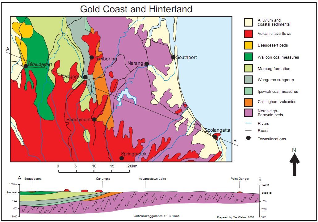 Currumbin Rock, is made of steeply inclined and well-bedded argillite and fine-grained greywacke of the Neranleigh-Fernvale beds. The rocks are older than the basalt boulders on Currumbin headland the boulders of basalt imported and placed around the car park and rock groyne.
