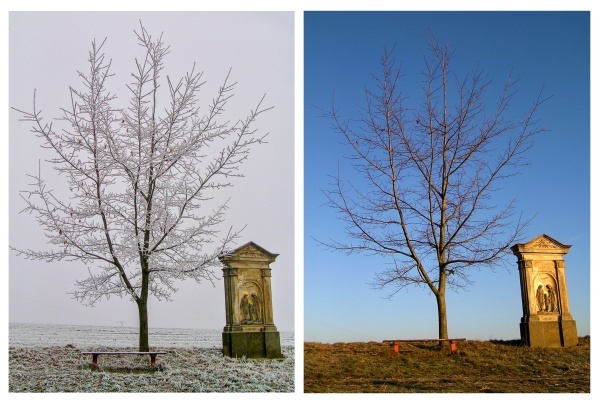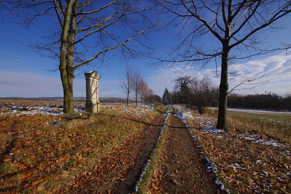 Kousek odtud je hezké posezení u kapličky s reliéfem svaté rodiny s názvem Útěk do Egypta, díla hořického sochaře Josefa Rychtery z roku 1832. Dojdete k ní pěknou alejí z dubů červených a starých třešní. Pamatuji si, jak tu koncem devadesátých let mladé doubky vysadili. Nu a podívejte se na ně dnes. Život je prostě krásný! A ten stromový obzvlášť ;O)