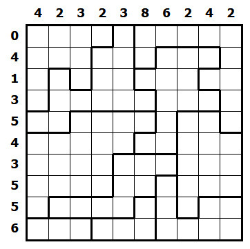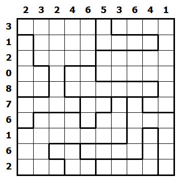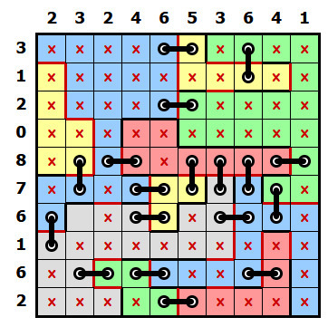 Pravidla jsou opět celkem jednoduchá. Máte mřížku, která je rozdělená na oblasti různých tvarů. Vaším úkolem je doplnit do mřížky díry a stehy. Každý steh musí vést z díry do díry a tato dvě políčka spolu musí sousedit vodorovně nebo svisle. (z jedné díry smí vést pouze jeden steh) Stehy musíte umístit tak, aby každá oblast byla s každou oblastí, která s ní sousedí (stačí stranou jednoho políčka), propojená právě jedním stehem. Čísla u řádků a sloupců potom udávají, kolik je v řádku/sloupci děr.