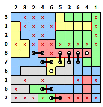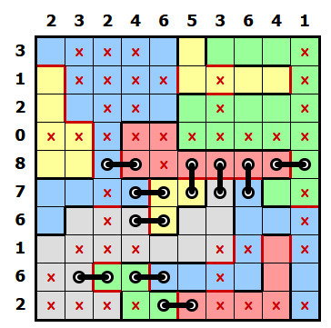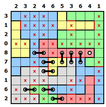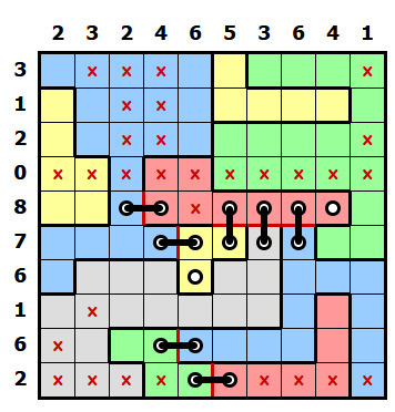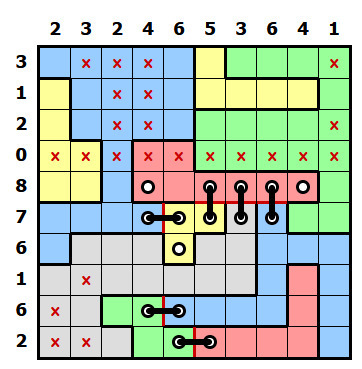 V této fázi už není těžké rébus doluštit střídáním předešlých postupů, já tady ale ještě ukážu pár dalších principů. Stejně tak jako pomůžou řádky a sloupce s malými čísly, někdy pomůžou i ty s vysokými čísly. Podívejte se na řádek s osmičkou. Jedno políčko už má křížek, chybí tak pouze jeden, ve všech ostatních políčkách musí být díry. Když se ale podíváte na první dvě políčka, z obou může vést jen steh do stejné modré oblasti, to znamená, že zde může být jen jeden steh a v jednom políčku bude křížek. (tím pádem si celý horní okraj žluté oblasti můžete označit červeně, nikde už další steh být nesmí) V řádku s osmičkou tak musí být díra v posledním políčku a vodorovný steh spojující růžovou a zelenou oblast.