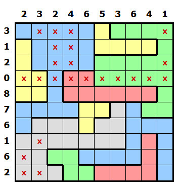 Dále si zakřížkujte všechna políčka, kde být díra a tím pádem ani steh nesmí. To znamená řádky a sloupce s nulou a políčka, která stranou nesousedí s vedlejší oblastí (tj políčka, která z žádné strany nemají tučnou čáru výjma krajové čáry okraje mřížky)