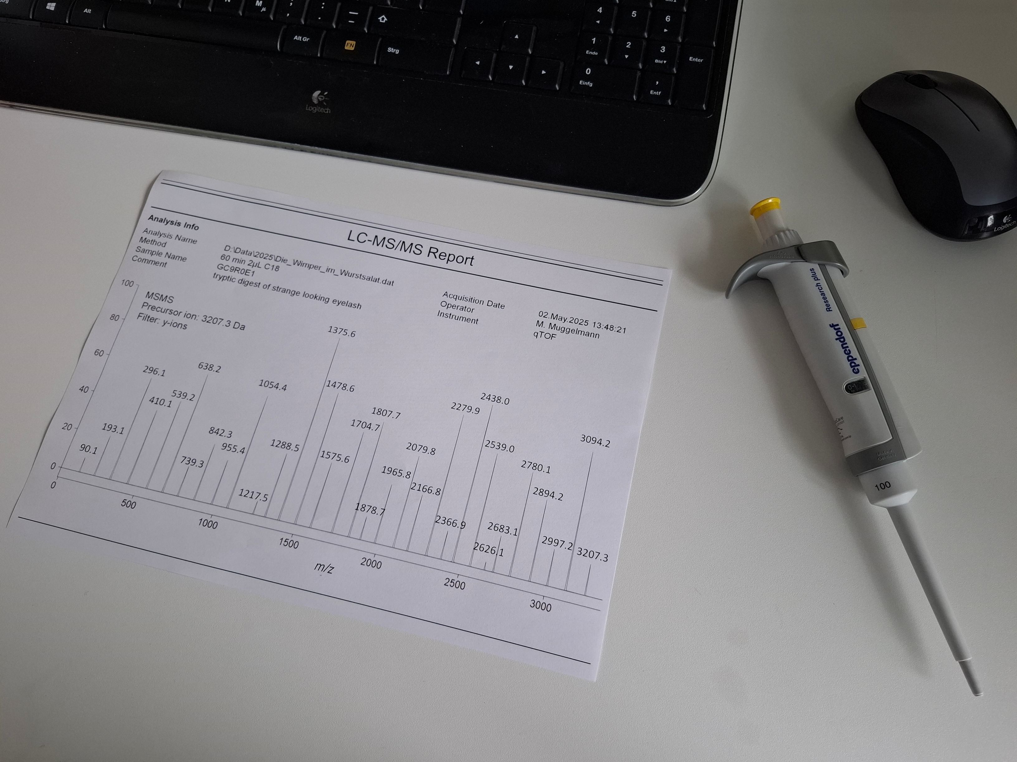 Aus Neugier beschlossen wir, das Haar untersuchen zu lassen. Also brachten wir es zu unserem Kollegen, Professor Muggelmann, einem Experten in der Massenspektrometrie. Er nahm das Haar mit spürbarem Interesse entgegen und versprach, es sofort zu analysieren.