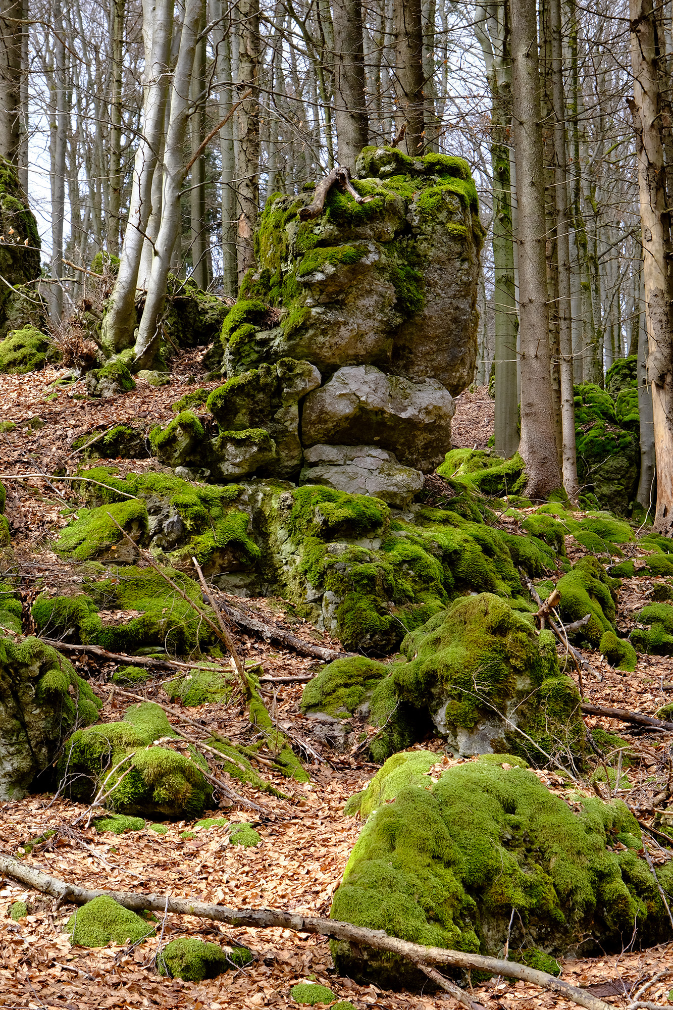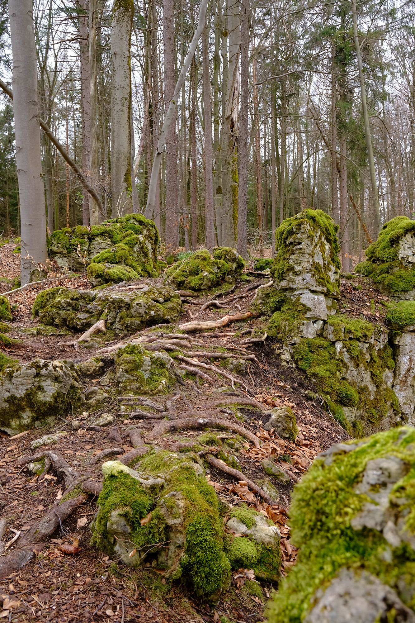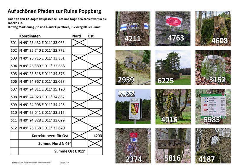 Es handelt sich nur um virtuelle Stationen, der Weg muss zur Beantwortung nicht verlassen werden. Geht bitte pfleglich mit der Natur um. Für den Cache müssen keine Höhlen betreten werden.