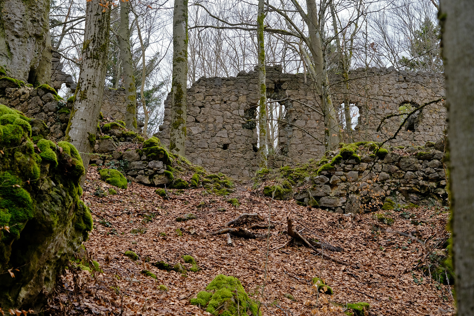 Vom Start geht es zunächst mit der "1" und Ausblick auf Alfeld durch den Magerrasen. Nach einem unmarkierten Abschnitt folgt man dem blauen Querstrich bis zur Ruine und, erneut nach einem unmarkierten Abschnitt, dem blauen Punkt bis zum Ausgangspunkt.