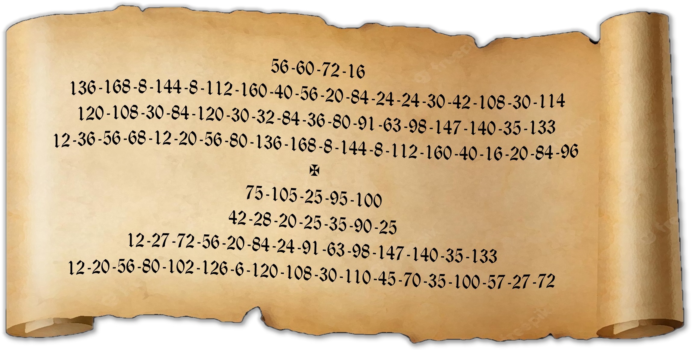 Des fouilles récentes à proximité de la commanderie de Valcanville ont mis à jour 53 parchemins d'origines diverses. Malheureusement, les historiens n'ont pas encore réussi à en déchiffrer un seul. De quoi parlent ces mystérieux parchemins? Pourraient-ils indiquer l'emplacement du trésor des templiers de Valcanville? Un(e) intrépide géocacheur(se) tel(le) que vous pourrait-il(elle) le retrouver?