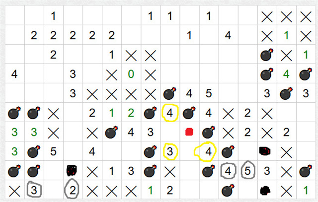 A ještě jeden poslední obrázek a pár dedukcí. Podívejte se na trojku a čtyřky, které jsou v dalším obrázku žlutě (dívejte se i v předešlém obrázku). U trojky dvě miny máme, ve zbývajících políčkách tak bude jen jedna. Vrchní čtyřka má s trojkou společná dvě políčka, dolní dokonce tři. Pro obě čtyřky platí, že ve společných políčkách s trojkou musí být jedna mina a všechna políčka, která společná nejsou, musí mít minu. (jinak by počty nevyšly). Z toho vyplývá, že mina musí být na tom jediném políčku, které je společné pro trojku i obě čtyřky. Pro větší přehlednost jsem tuhle minu nakreslila červeně.