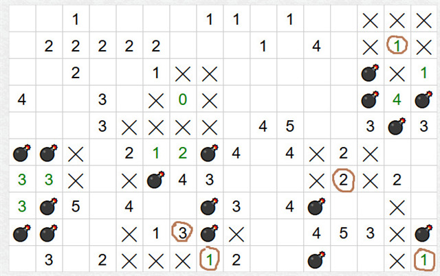 Jakmile takhle vyřešíte dvojice čísel, zkoumejte okolí, často se tím vyřeší i další čísla. (v dalším obrázku zakroužkovaná hnědě) Vpravo nahoře se nám vyřešila jednička, je v ní jedna mina, další políčka tak můžeme zakřížkovat. Dále trojka dole uprostřed. Ve společných dvou políčkách se čtyřkou nahoře bude jedna mina, jedna mina tak musí být ještě ve volném políčku vpravo od trojky. Tím se vyřeší jednička dole.