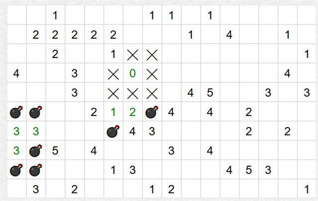 Pro následující kroky je potřeba mít doplněné miny, které vycházejí z jasných jednotlivých čísel. U následujících kombinací je možné něco doplnit.