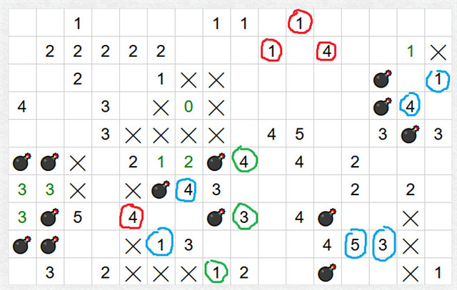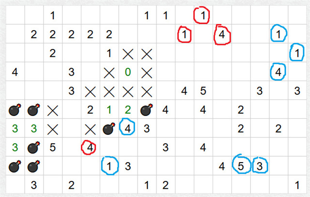 Tento postup by stačil pro lehké rébusy, ale to by bylo moc easy :) Takže zkusíme středně těžký rébus a hledat vztahy mezi čísly, která mají společná políčka. Nejprve hledejte velká a malá čísla blízko sebe, ideálně 1 a 3, 1 a 4, 1 a 5..... Nějaké kandidáty jsem zakroužkovala. Jak vidíte,ne vždy tato kombinace pomůže, ale občas ano. Třeba nahoře máte kombinaci dvou jedniček a čtyřky (červeně), ale vzhledem k tomu, že kolem čtyřky je hodně volných políček, tak to moc nepomůže. Stejně tak modrá jednička a červená čtyřka dole. Ale třeba čtyřka a jedničky (modře) vpravo nahoře už jsou lepší. Je jedno, kterou jedničku vezmete v potaz, já zvolila tu šikmo vpravo. Máte dvě společná políčka, díky jedničce v nich bude jedna mina, z toho vyplývá, že ve všech ostatních políčkách čtyřky budou miny a v políčku jedničky, které nepatří čtyřce, mina nebude.