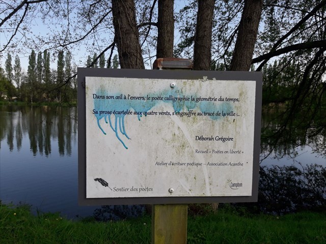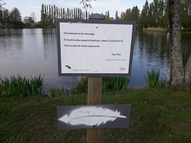 Ce beau plan dâeau offre un petit parcours en boucle dâenviron 1 km. Vous pourrez y lire quelques phrases dâauteur sur les panneaux.
