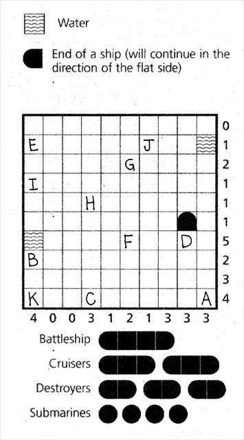 This grid represents a section of ocean in which a fleet is hiding. This fleet consists of one battleship (four grid cells in length), two cruisers (three cells each), three destroyers (two cells each) and four submarines (one cell each).