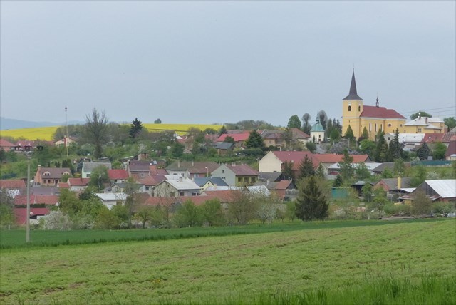 Centrum obce s tvrzí a kostelem zdálky od jihu; tvrziště nalevo lze rozeznat podle mohutného rozvětveného stromu u májky