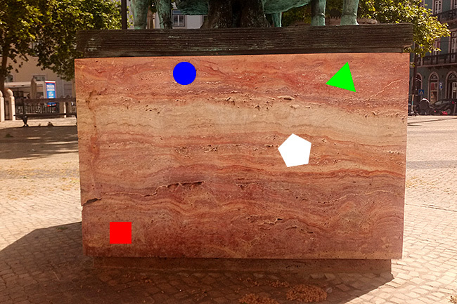 No ponto zero, coordenadas publicadas e que são as da estátua do Padre António Vieira, na da base da estátua, o plinto, onde se pode ver o travertino e na face virada para o Museu de São Roque. Para responder às perguntas use a foto spoiler 1.