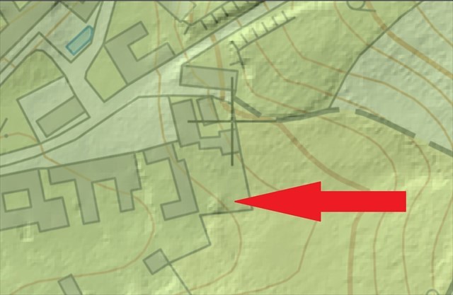 Reliéfní podoba místa s tvrzištěm zachycená pomocí LIDAR; tvrziště už na ní prakticky není zřetelné