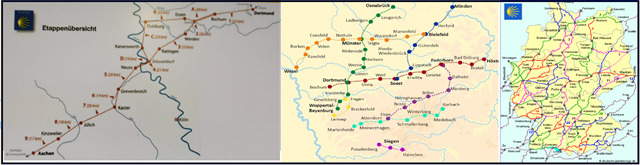 Ein 2. Weg führt von Dortmund über Essen, Ratingen, Neuss, Jülich nach Aachen und mündet dort in den von Köln kommenden Weg. Dann kann es weitergehen nach Lüttich in Belgien und auf die französischen Wege, die nach Vezelay oder Paris führen.