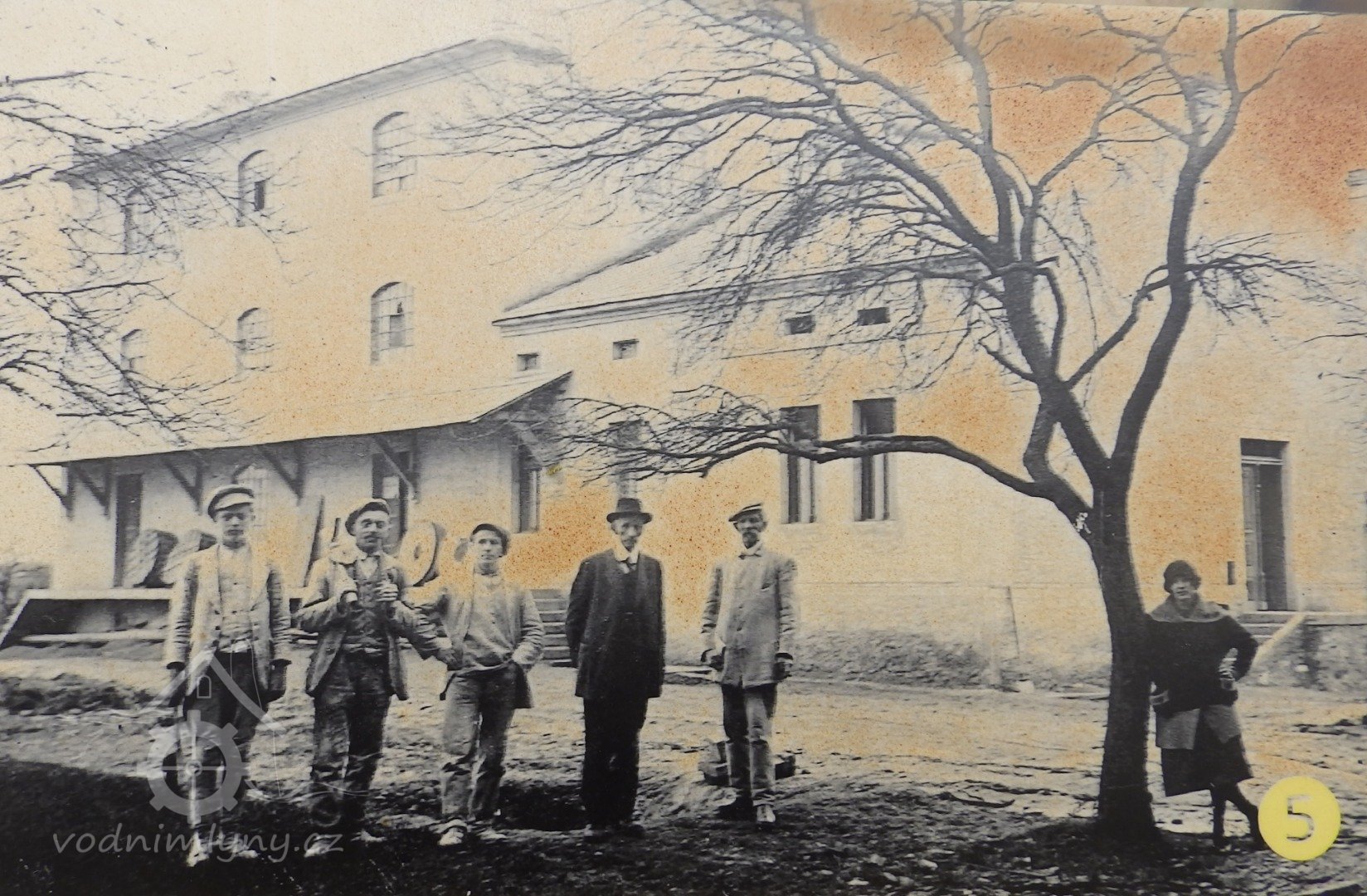 Osádka mlýna, uprostřed v černém Václav Čech, po jeho levici syn Josef, 1930, převzato z https://www.vodnimlyny.cz/mlyny/objekty/detail/7655-cechuv-elektricky-valcovy-mlyn