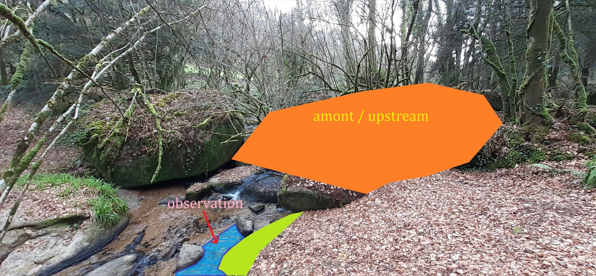 Question 1 - Décrivez la zone en amont (en orange) du point d'observation