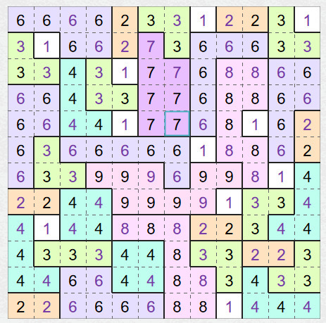 Na pravidlech zas není nic těžkého. Máte mřížku a v ní nějaká čísla. Vaším úkolem je vytvořit oblasti, které budou mít tolik políček, kolik udává číslo. Číslo si pište do každého políčka. Tj. oblast o sedmi políčkách bude mít v každém ze sedmi políček sedmičku. Políčka jedné oblasti jsou propojená stranou (tj. nestačí rohem) a oblasti se stejným číslem se nesmí dotýkat stranou, ale rohem můžou. Žádné políčko nezůstane prázdné.