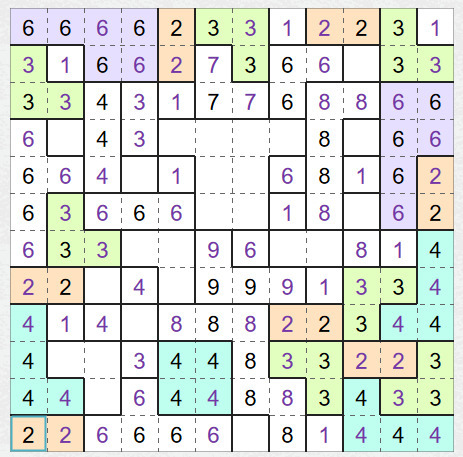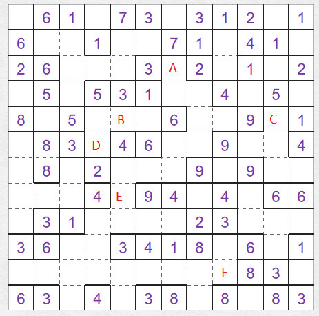 Pokud jsou dvě stejná čísla blízko u sebe (např. je mezi nimi jedno volné políčko), musíte sami zjistit, jestli patří do jedné oblasti nebo do dvou. Zvlášť u vyšších čísel to většinou poznáte podle prostoru, který máte k dispozici, jestli se vám tam vejdou např. dvě oblasti o devíti políčkách nebo jedna. U nižších čísel to takhle většinou nepoznáte a vyplyne to během luštění jinak.