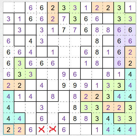 Zvlášť ke konci už někdy předešlé principy nestačí a je třeba zkoumat vztahy mezi oblastmi. Podívejte se na dva červené křížky. Může tu být čtyřka nebo šestka. Kdybychom ale dali do políček čtyřky, odříznete šestku vpravo a už z ní neuděláte šestipolíčkovou oblast. Takže tu musí být šestky. (v políčku vpravo v posledním řádku tak bude osmička, šestka už tam nedosáhne)