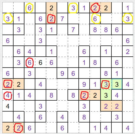 Další jednoduchá strategie je zkoumat prázdná políčka, většinou najdete některé, do kterého dosáhne jen jedno číslo. Ta jsem zakřížkovala žlutě. Tak např. 1. křížek v 1. řádku: zde může být jen šestka. Druhý křížek: jen trojka. Po jejím doplnění může být na místě 1. křížku v posledním sloupci jen šestka. Křížek pod červenou dvojkou: jen čtyřka, stejně tak křížek pod čtyřkou: jen čtyřka. Tím pádem je čtyřková oblast kompletní a pod ní musí být trojka. Spodní roh se pak dá snadno dokončit.