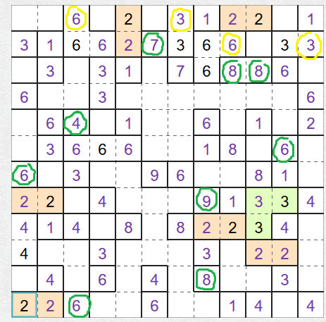A pozor třeba na šestky vlevo dole, je jich tam hodně u sebe. (beru stav před doplněním osmiček) Všimněte si,, že u zakroužkované šestky nefunguje, že máte jen tři políčka nahoru, tak musíte vpravo, protože se napojíte na další šestku a to mění situaci. Ještě to necháme být.