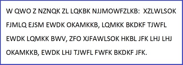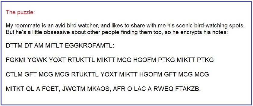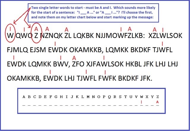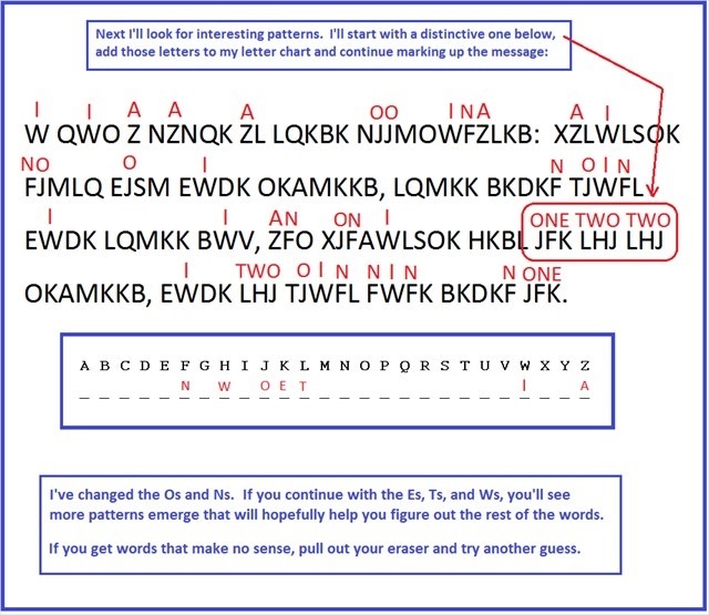 Using the example message from above, we can practice some of these techniques. You can print a copy ("3. Example puzzle" from the Gallery) and follow along.
