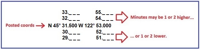 Remember: The posted coordinates for this cache are N 45° 31.500 W 122° 53.000, so the solution should be within 1 or 2 minutes. Look for patterns for words to spell out these numbers:
