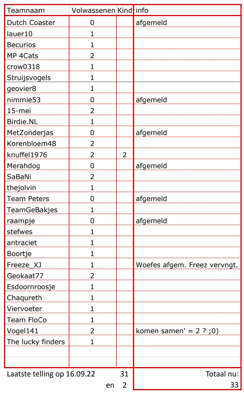 Planning 9:00 - 13:00 uur 17 september 2022.