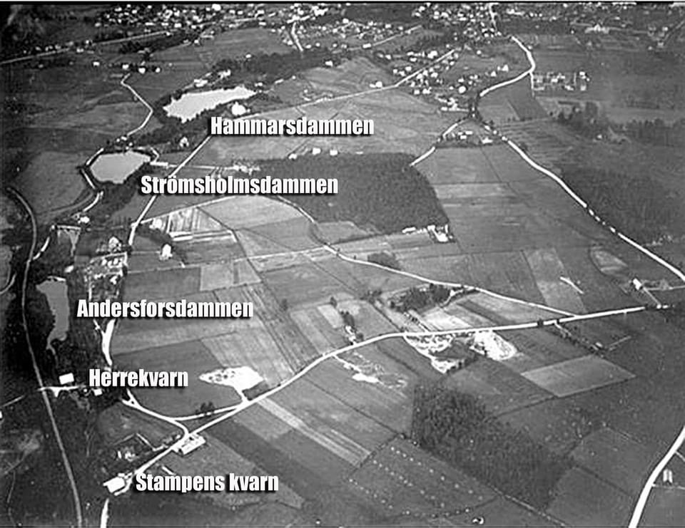 Ett gammalt flygfoto över dammarna vid Hjoån.