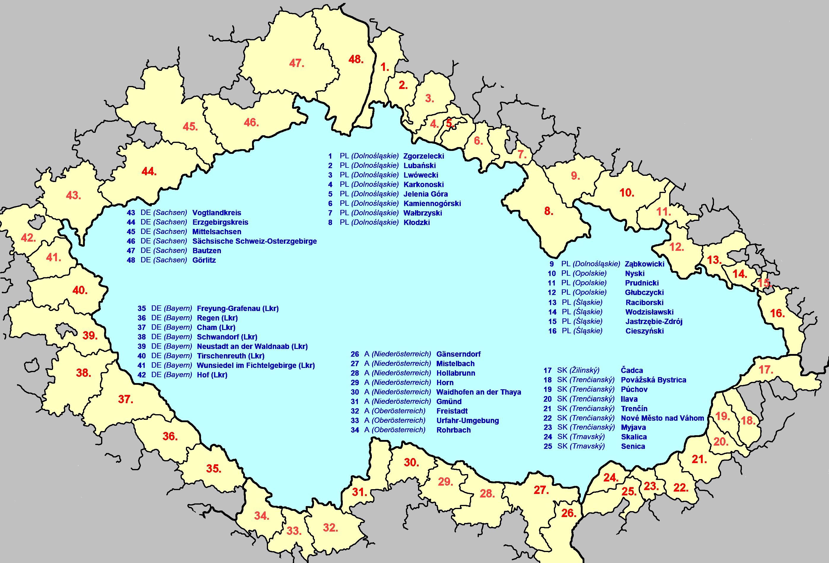 - A německé Bavorsko (Bayern) je oříšek. Okresy: Freyung-Grafenau (Lkr), Regen (Lkr), Cham (Lkr), Schwandorf (Lkr), Neustadt an der Waldnaab (Lkr), Tirschenreuth (Lkr), Wunsiedel im Fichtelgebirge (Lkr) a nakonec Hof (Lkr).