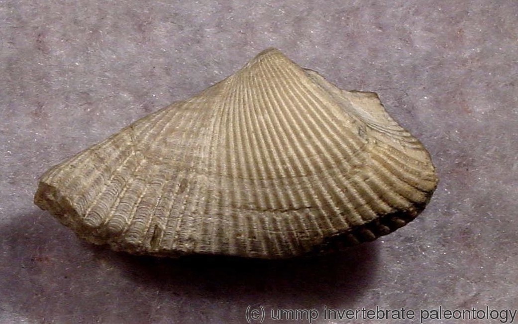 The rostroconchs look somewhat like bivalves (= clams and the like), but they are actually pseudobivalves. They have a continuous, non-valved calcareous shell, roughly shaped like a taco. During its growth, the organism breaks the shell along a "hinge line" and glues it back together. This results in tiny breaks and cracks that are reattached. True bivalves have two separate calcareous shells held together by organic material.Â