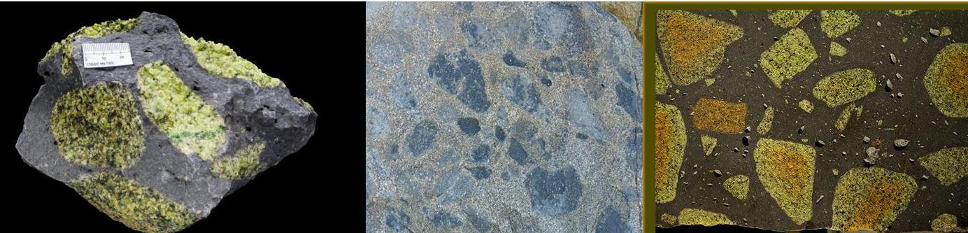 - Describe the size range, shape and colour of the xenoliths and whether the grain/crystal size and surface texture of the xenoliths differs from the surrounding rock.