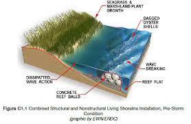 Living shorelines are a man made attempt to replicate a natural phenomenon caused by reefs. It is a relatively recent approach for addressing shoreline erosion and protecting marsh areas. Unlike traditional structures such as bulkheads or seawalls that worsen erosion, living shorelines incorporate as many natural elements as possible which create more effective buffers in absorbing wave energy and protecting against shoreline erosion. The process of creating a living shoreline is referred to as soft engineering, which utilizes techniques that incorporate ecological principles in shoreline stabilization. The natural materials used in the construction of living shorelines create and maintain valuable habitats. Structural and organic materials commonly used in the construction of living shorelines include sand, wetland plants, sand fill, oyster reefs, submerged aquatic vegetation, stones and coir fiber logs.
