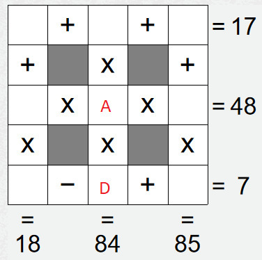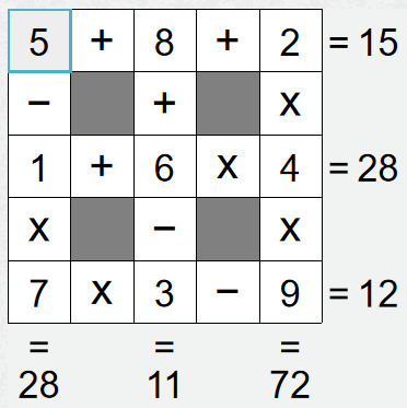 Navíc žádné číslo se nesmí opakovat, tudíž pokud máte jeden výpočet vodorovně a druhý svisle, které mají jedno společné políčko, vy potřebujete takové dvě kombinace čísel, kde je právě jedno číslo stejné, ale ostatní musí být jiná.