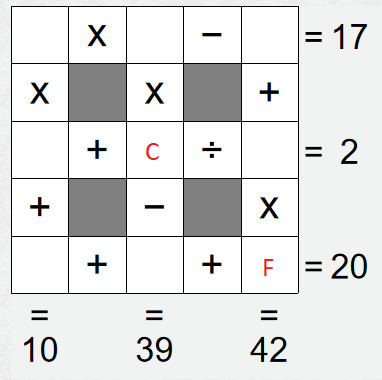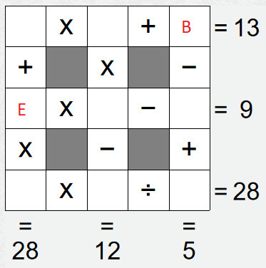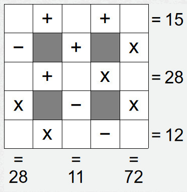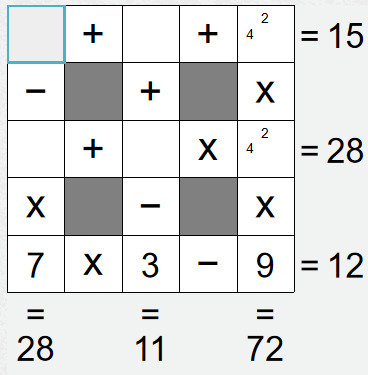 Vaším úkolem bude doplnit do mřížky čísla 1 - 9 (každé právě jednou), tak, aby výpočty platily. U výpočtů se postupuje zleva doprava (seshora dolů), takže pozor, neplatí pravidlo, že násobení a dělení má přednost před sčítáním a odčítáním (tj. v tomto rébusu 2 + 3 x 7 = 35).