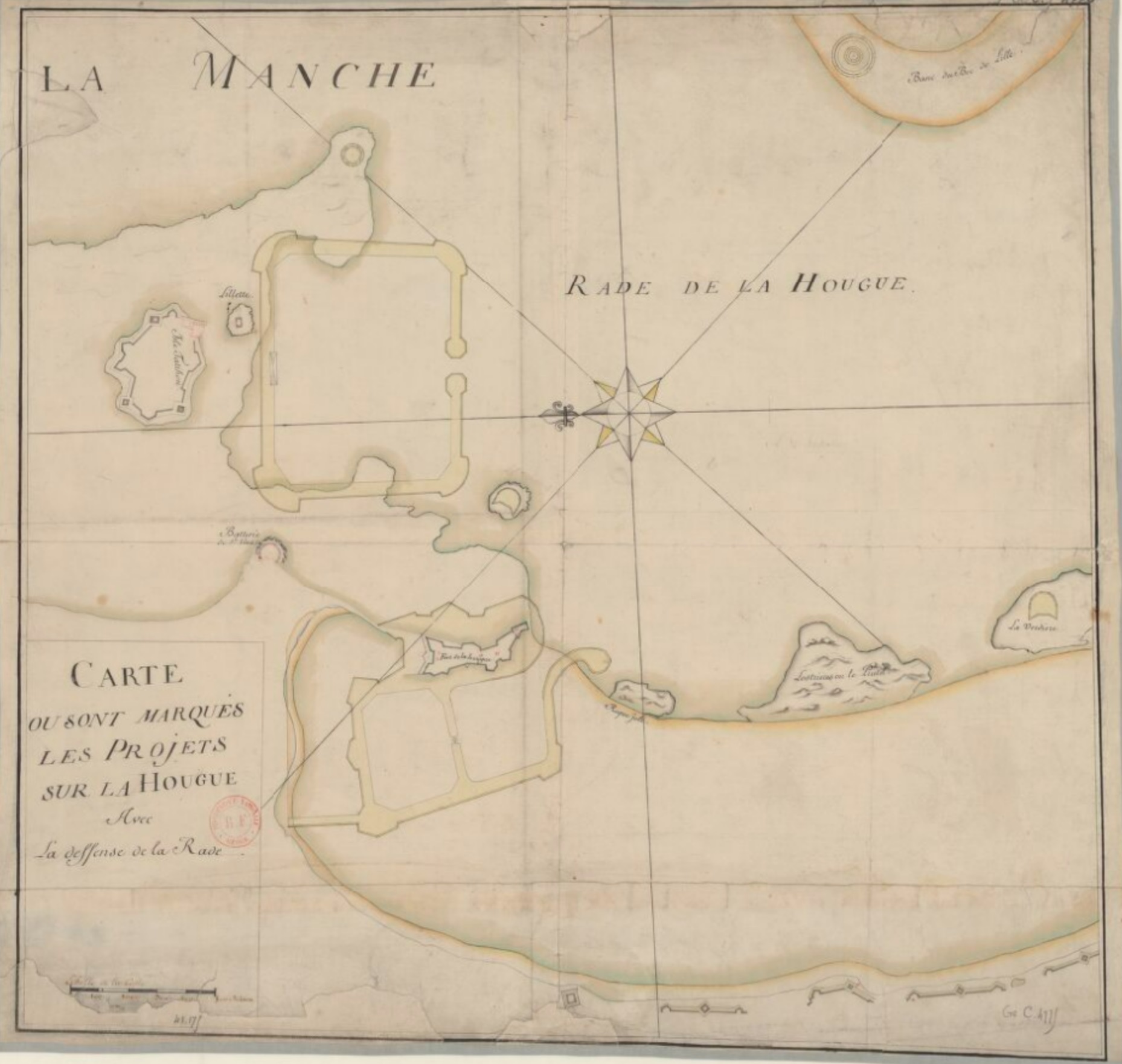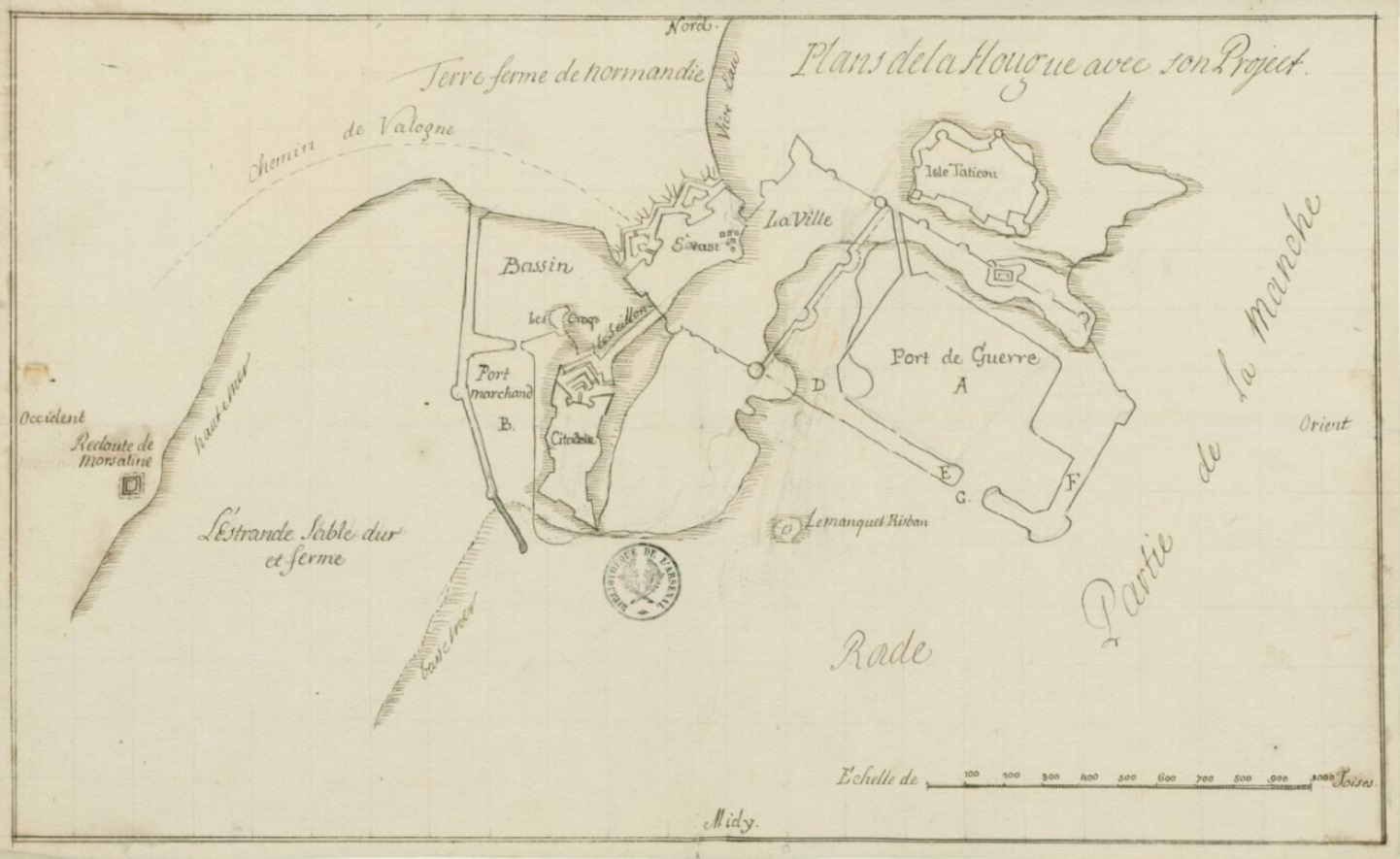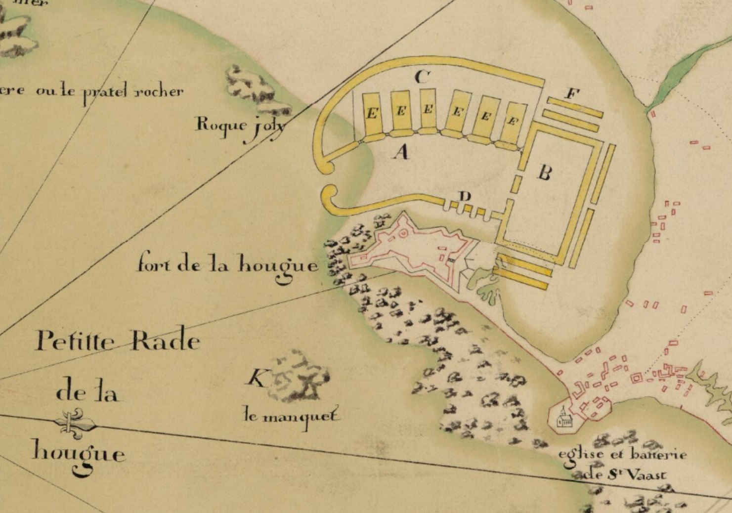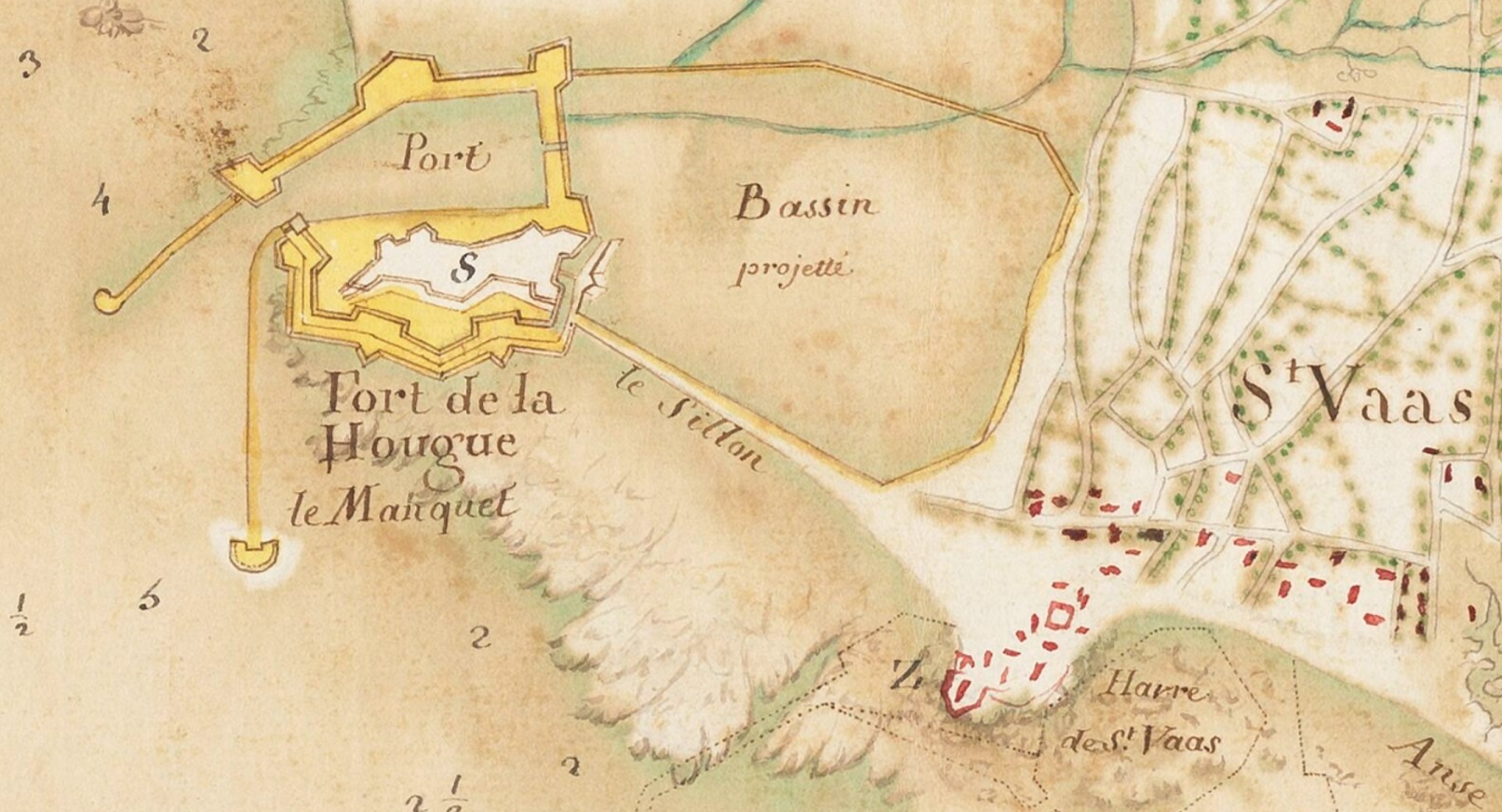 L'endroit était jadis le "Port aux Dames", l'ancien port de Saint-Vaast-la-Hougue dont les taxes étaient perçues par les "Dames" de l'abbaye de Caen. Au fil des siècles, différents projects ont été proposés pour le transformer en port militaire, avant que Cherbourg soit finalement préféré. De ces projects ne restent que quelques cartes, telle une fenêtre sur un futur qui ne s'est jamais réalisé.