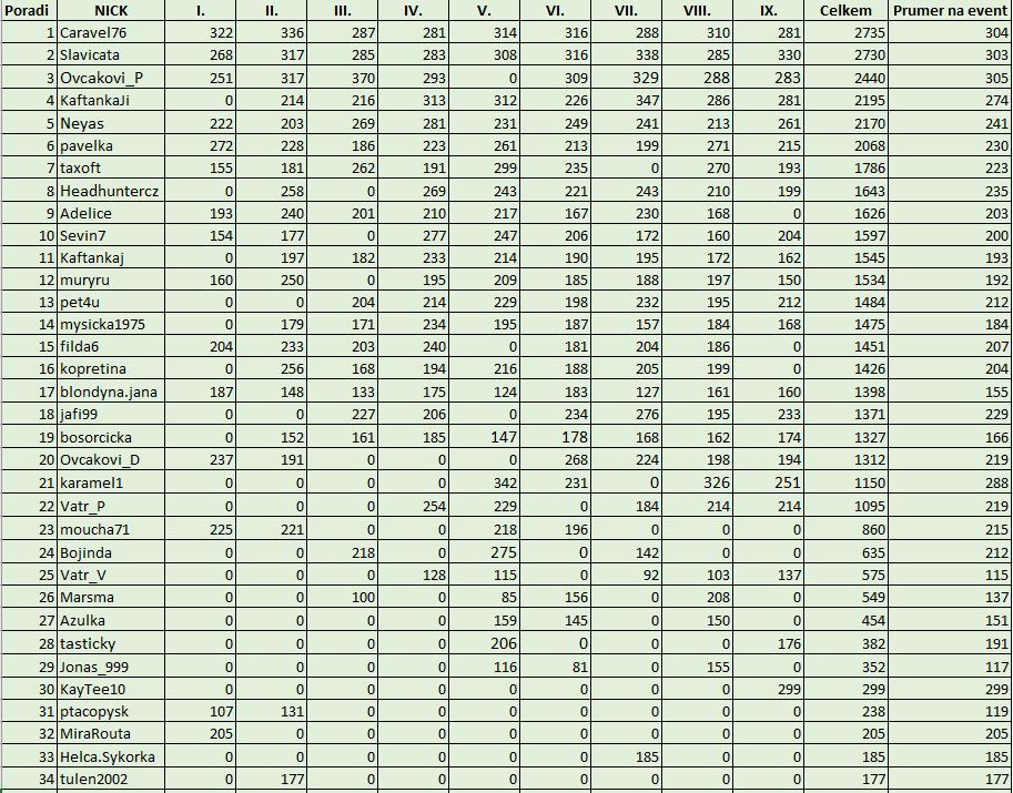 - Vitezem sezony bude hrac s nejvyssim souctem bodu za obe hry vsech eventu, kterych se ucastnil. Nezalezi jen na zrucnosti, lze vyvazit dochazkou :-).