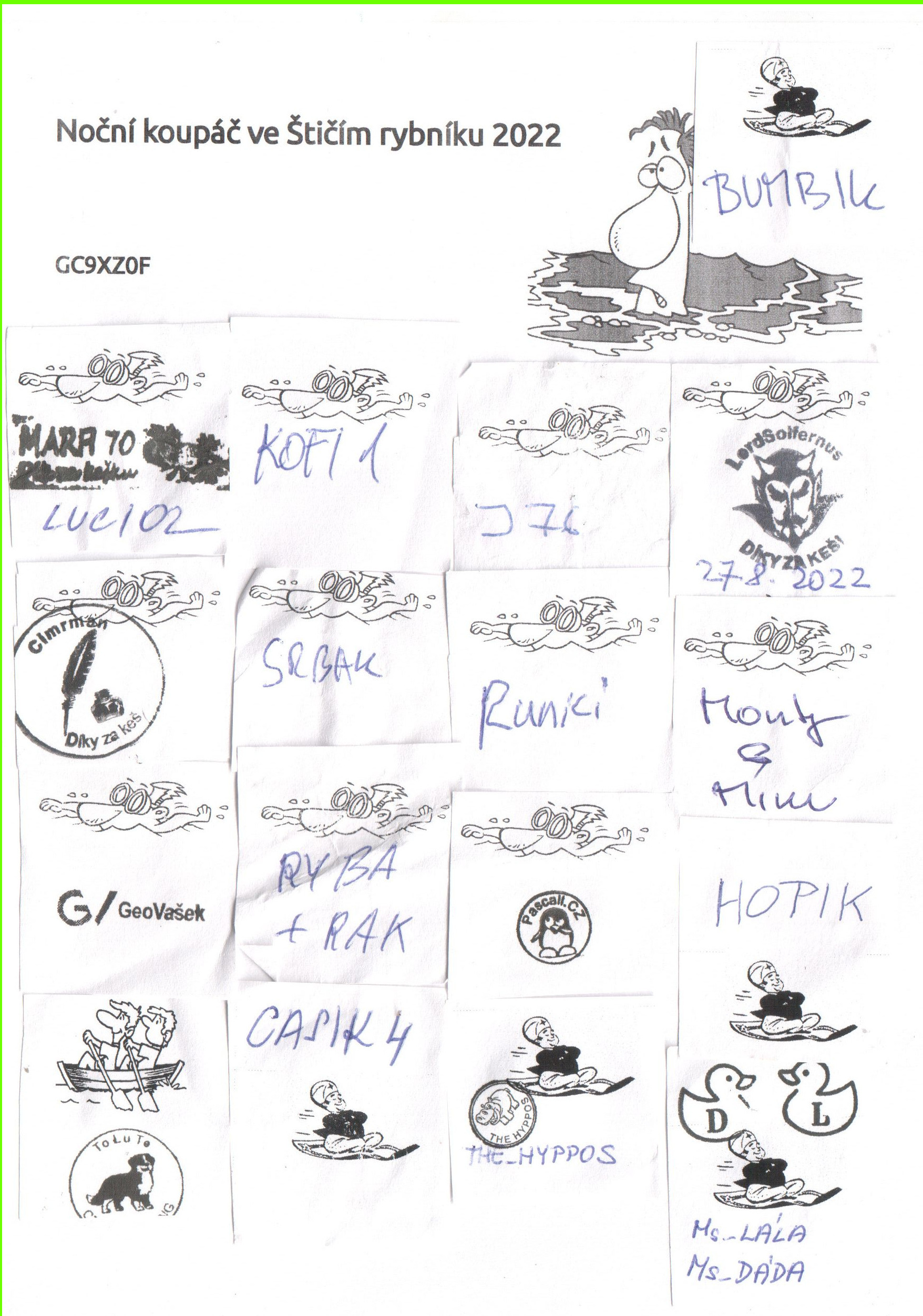 Sejdeme se na uvedenem parkingu, kde bude probihat neformalni 'sucha' a pripravna cast eventu. Zde take kazdy obdrzi logovaci karticku, kterou dle svych schopnosti dopravi do logbooku na souradnice eventu. Vsichni plavci se mohou tesit i letos na tradicni malou odmenu.