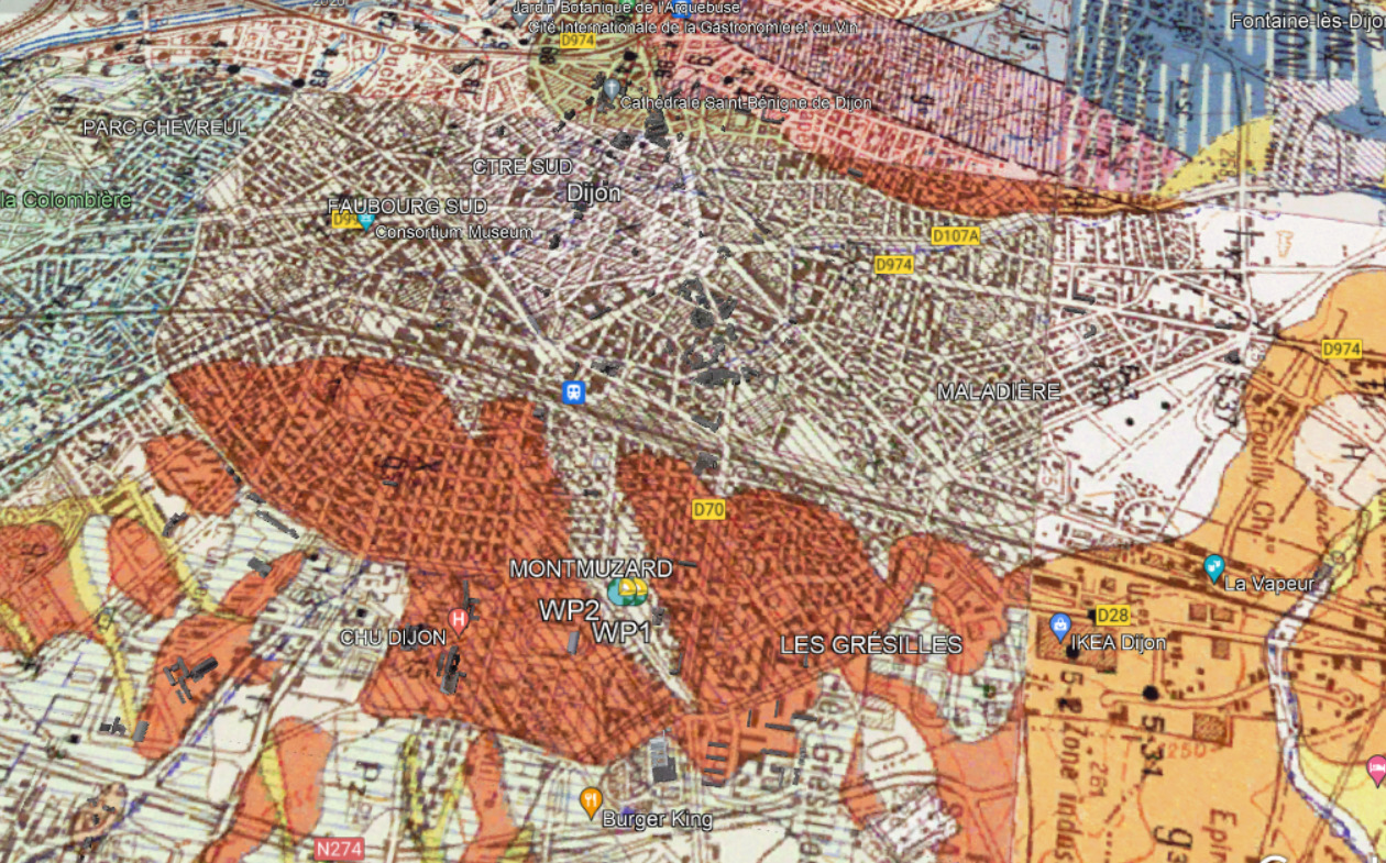 X1. Backfill or anthropogenic soils masking the bedrock. These are artificial deposits or heavily reworked land with significant contributions (cities of Dijon and Auxonne inside the old fortifications, forts around Dijon, etc.) completely masking the substratum and which can reach several meters in thickness.