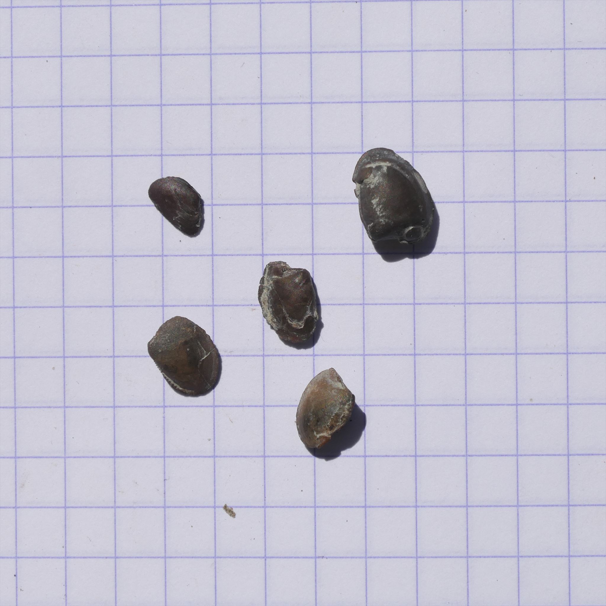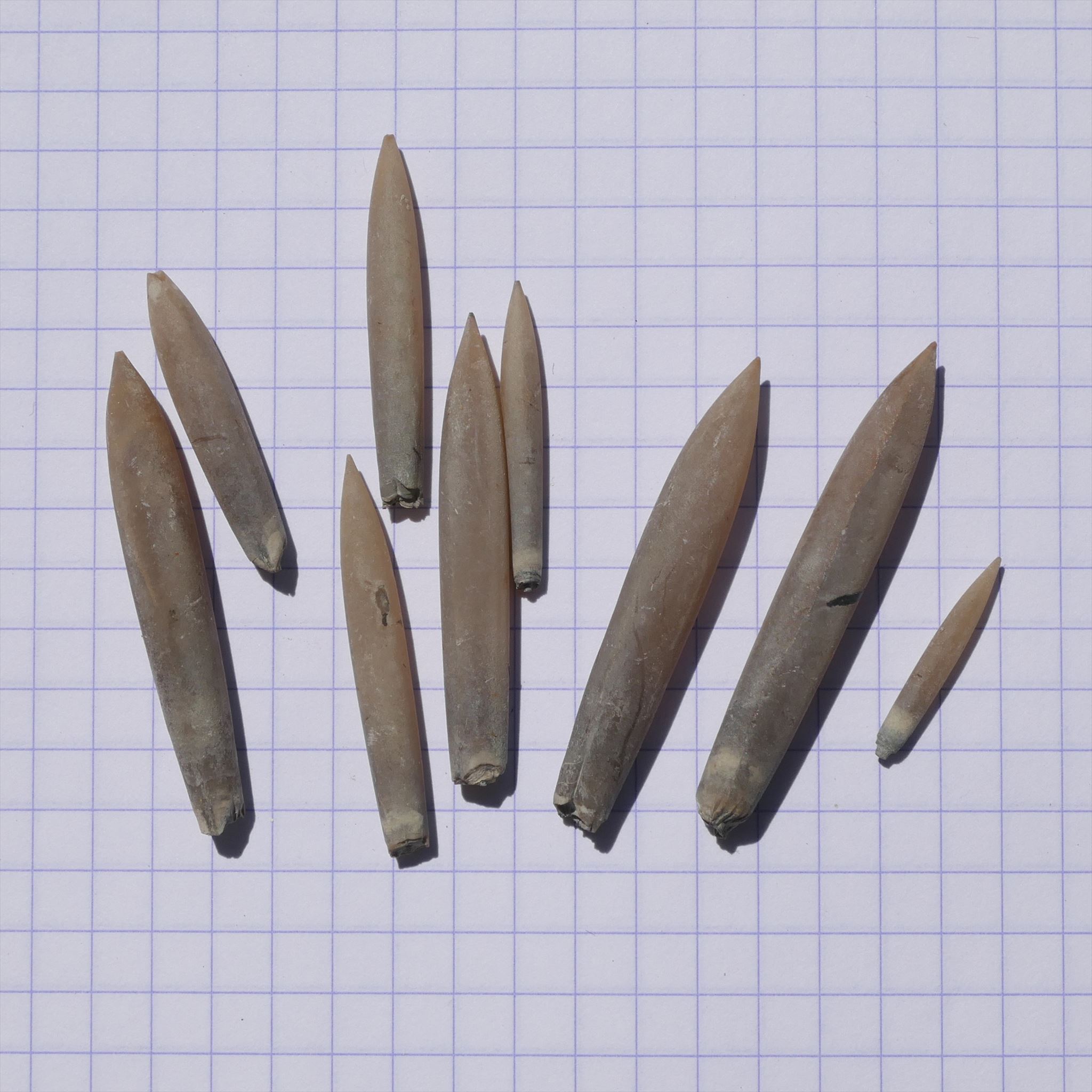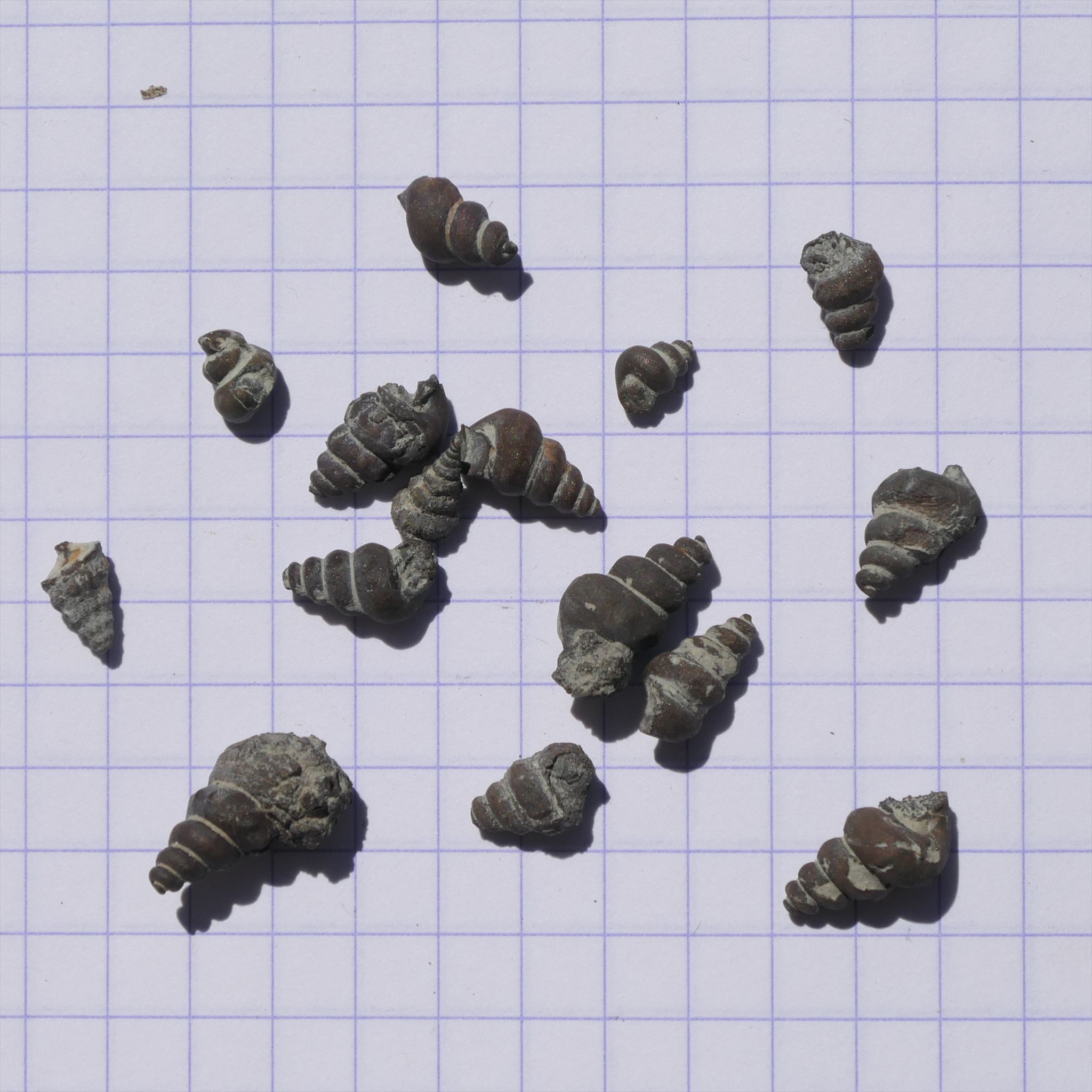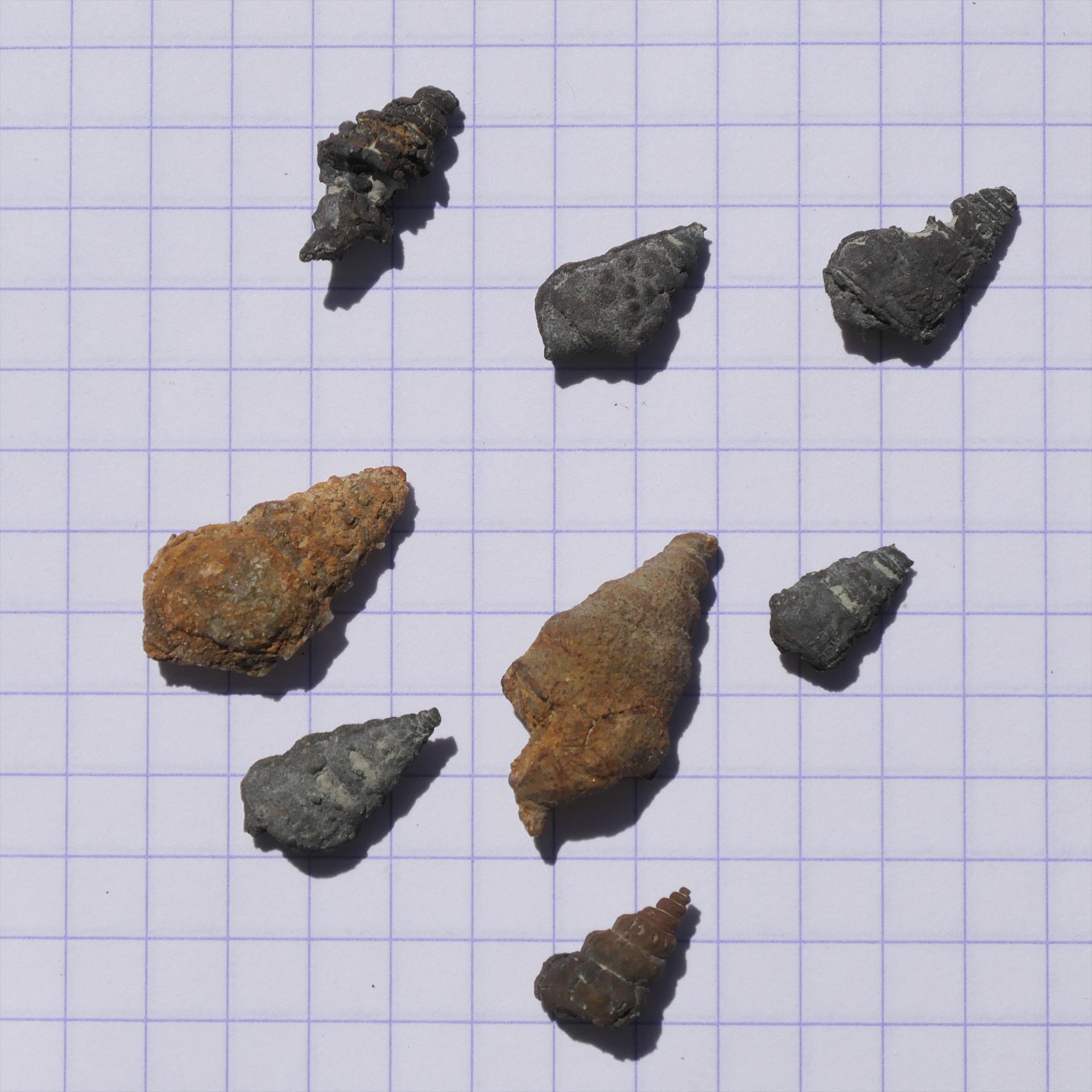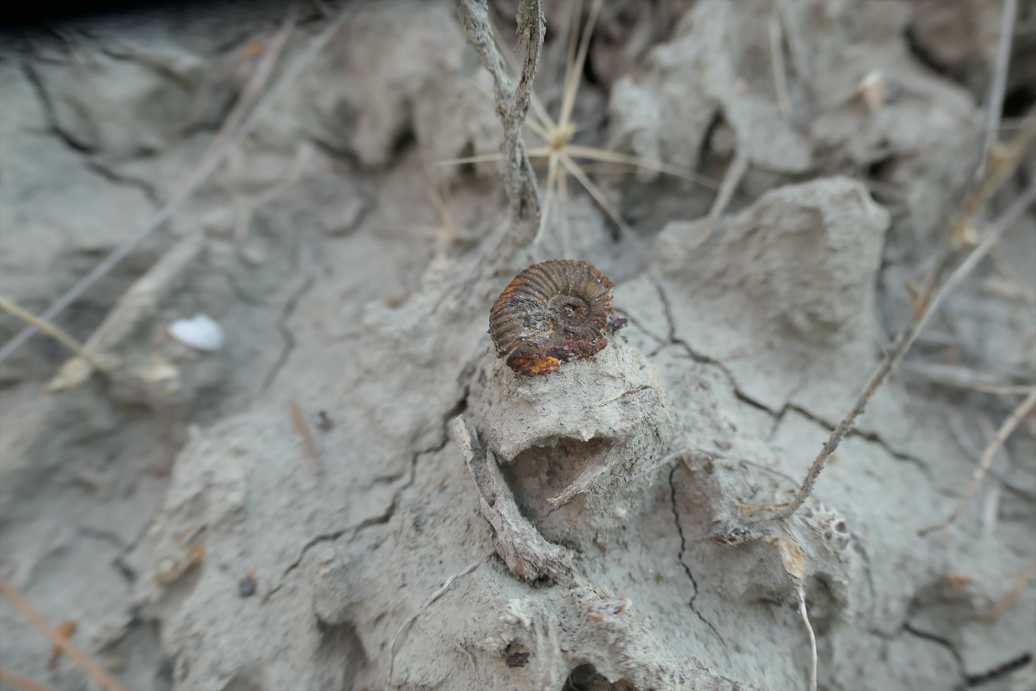 These gray clays are very fossiliferous. Molluscs are found there in abundance: ammonites, belemnite rostrums, gastropods, bivalves but also corals, sea urchins, shark teeth... The fossils are small, often pyritized (the shell is replaced by pyrite: iron sulphide). They oxidize and deteriorate easily.