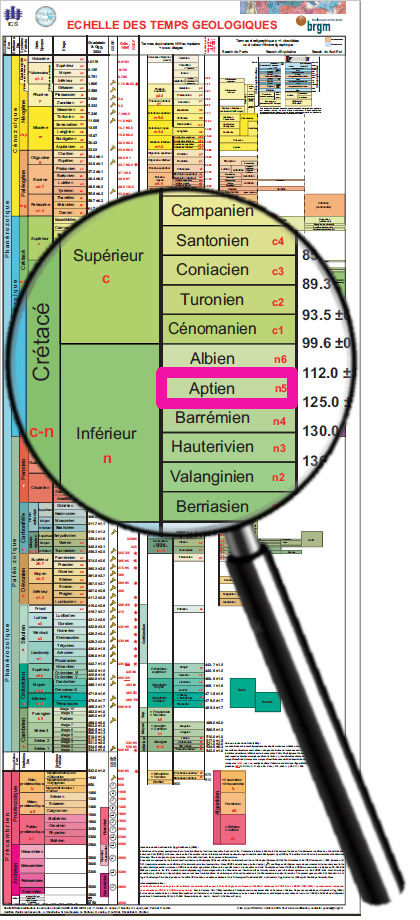 Aujourd’hui l’Aptien couvre la période entre -125 et -113 millions d’années, au Crétacé inférieur dans l’ère Secondaire (ou Mésozoïque). Lorsque d’Orbigny créa l’Aptien, il existait 27 étages, il en existe aujourd’hui plus de 100 !
