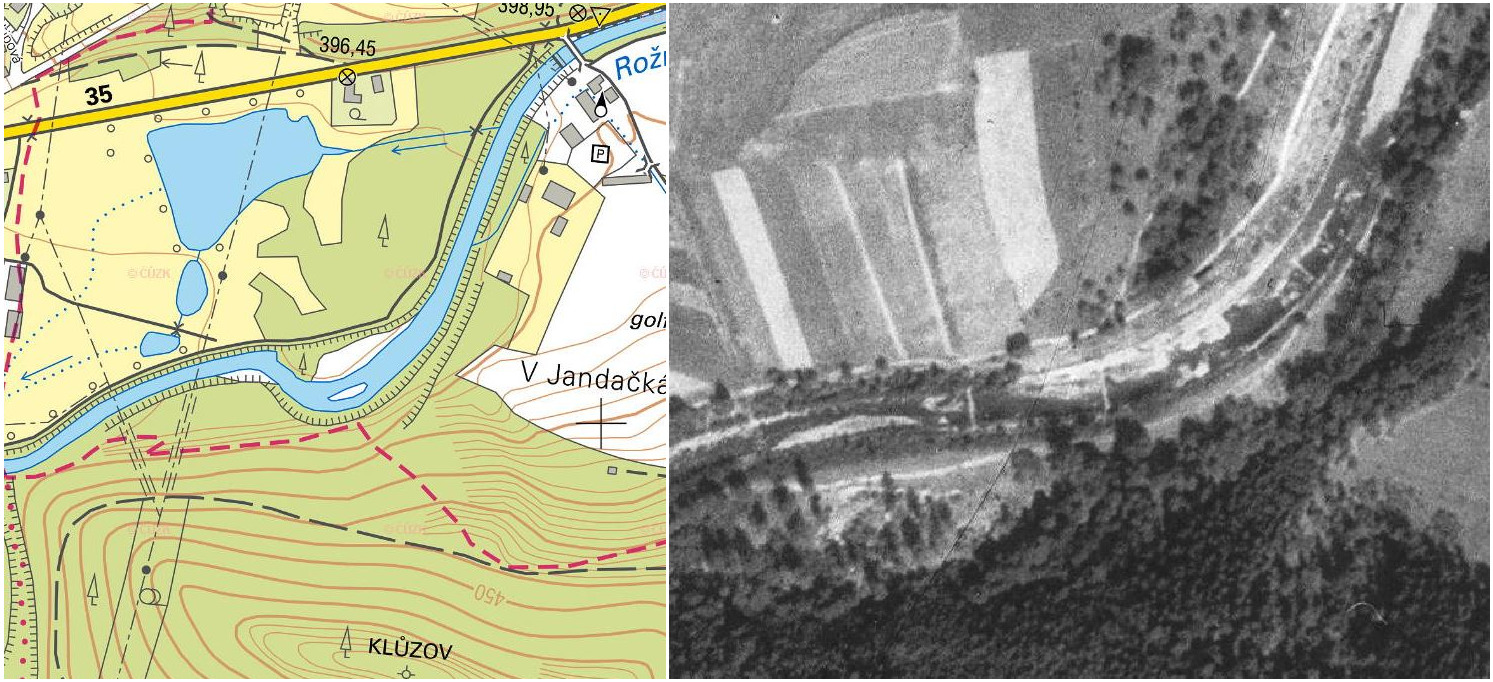Jak bude místo vypadat za řekněme dalších 50 let? Zcela jistě úplně jinak, bez ohledu na to, jestli se ho pokusí přetvořit člověk a nebo se vše nechá na přírodě. Na leteckém snímku z 50. let je patrné, že tehdy zde ještě žádný Ostrov nebyl, nebyla ani ostrá zátočina zakousnutá do svahu Klůzova a řeka tehdy tekla spořádaně v mírně zahnutém korytě.