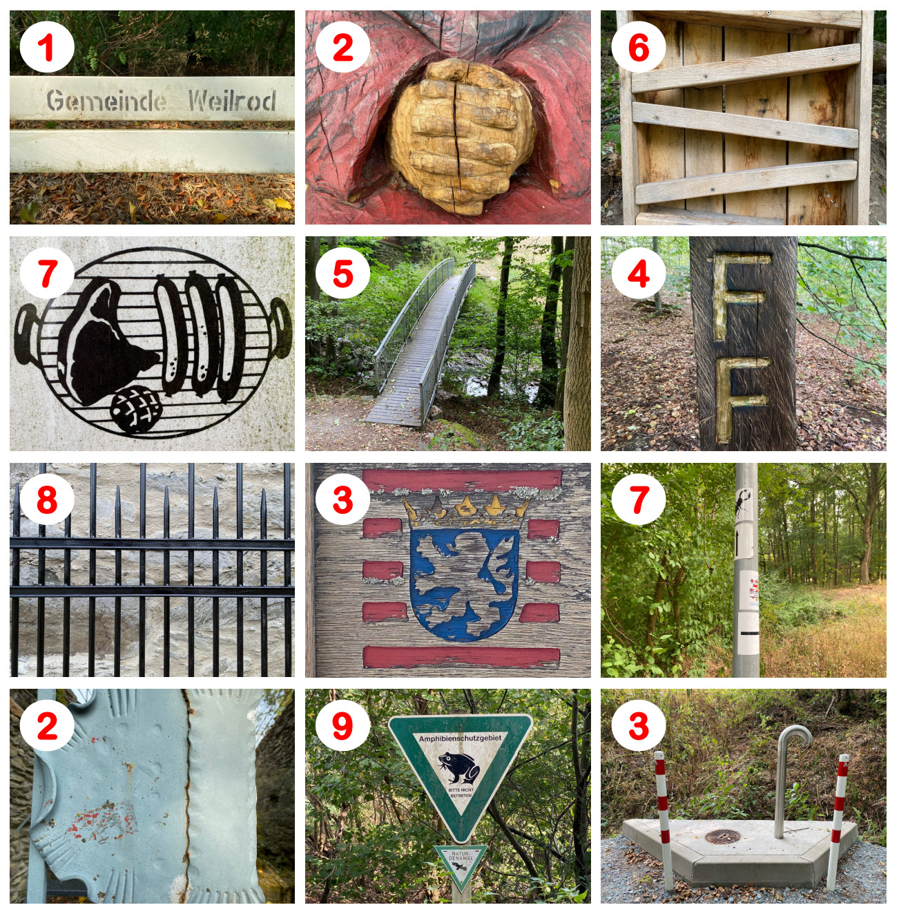 Während der Wanderung müsst Ihr an den angegebenen Wegpunkten das passende Bild aus der Bildersammlung (BILD oder PDF) dem jeweiligen Ort zuordnen. So erhaltet Ihr die Werte für die entsprechenden Buchstaben.