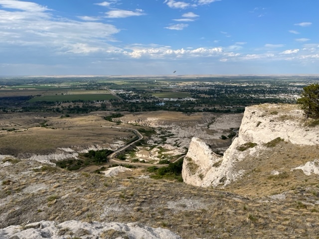 The Orella Badlands cover 500 acres and consist of domes (formation in shape of a dome), ravines (deep narrow gorges with steep sides), plateaus (areas of relatively high level ground), tunnels, and arches. When the humidity is high, the whole area which is normally pale yellow turns to various hues of pink and red. Many fossilized animal remains have been found here, principally turtle shells and Oredont skulls. This tortured land led the Indians to name the bluffs “Me-a-pa-te”, which translates to “hill hard to go around”. It also forced wagon trains to journey further south to find a way back to the river. The badlands are an example of rapid erosion in soft rock beds of similar uniform composition. The main rock formation in this section is Brule clay, which is very soft and sand like, and as a result it erodes quite easily. When this clay is unprotected by more durable formations, erosion produces a pattern of irregular gullies known as “badlands”. The oldest exposed rocks are of the Orella Member of the Brule Formation and White River Group and are roughly 33 million years old. This is the badlands area that you see in front of you and consists of siltstones and mudstones with interbedded thin lenticular (shaped like lentil) sandstones. The sandstone and siltstone layers that you see represent floodplain and channel deposits of ancient streams that flowed eastward from the Rocky Mountains as they were being uplifted.